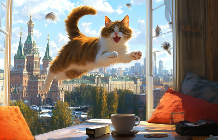 Кот резко вскакивает, глаза становятся как блюдца, хвост превращается в метлу для подметания пола — и вот он уже мчится к окну, чтобы «поймать» солнечный зайчик, которого никто, кроме него, не видит.