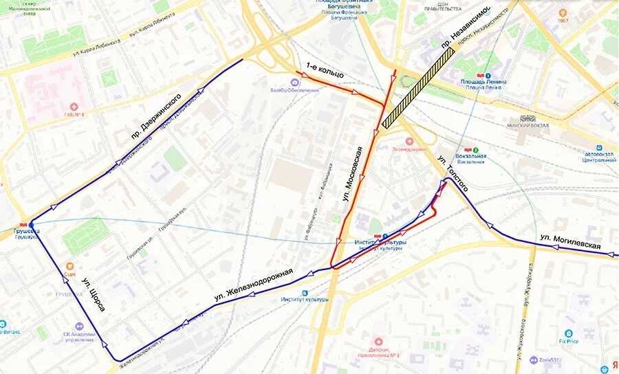 - при движении с ул. Аранской — по ул. Толстого, Вокзальной, Суражской, Железнодорожной, Щорса, пр. Дзержинского и ул. Толстого.