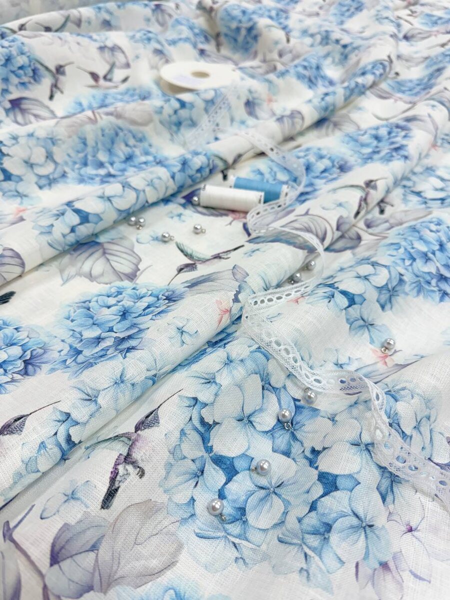 Чудесный лён с гортензией и маленькими птичками колибри.