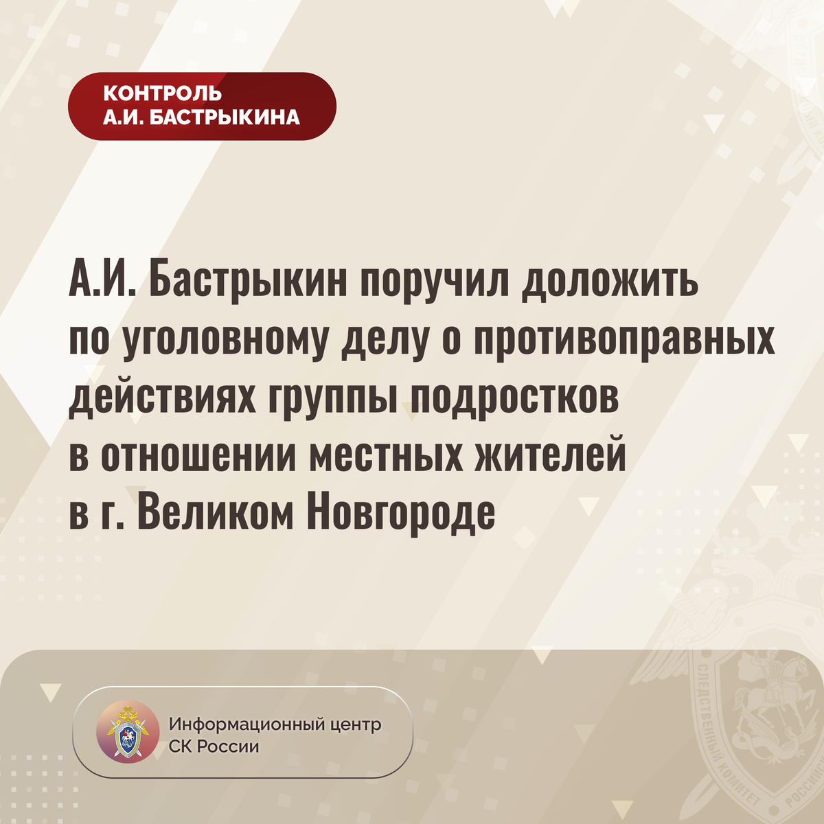 А.И. Бастрыкин поручил доложить по уголовному делу о противоправных действиях группы подростков в отношении местных жителей в г. Великом Новгороде В СУ СК России по Новгородской области возбуждено уголовное дело по ст. 213 УК РФ (хулиганство) по факту массовой драки в городе Великом Новгороде. По данным следствия, 22 марта текущего года более 20 подростков, используя малозначительный повод, на улице жестоко избили троих молодых людей, в том числе инвалида и несовершеннолетнего. Фигуранты снимали происходящее на видео, после чего опубликовали запись в социальных сетях. У двоих пострадавших диагностированы переломы носа, у третьего - многочисленные ушибы. Указанное происшествие получило распространение в социальной сети. Председатель Следственного комитета Российской Федерации Александр Иванович Бастрыкин поручил руководителю СУ СК России по Новгородской области Николаю Николаевичу Супруну представить доклад об установленных в ходе первоначальных следственных действий обстоятельствах, а