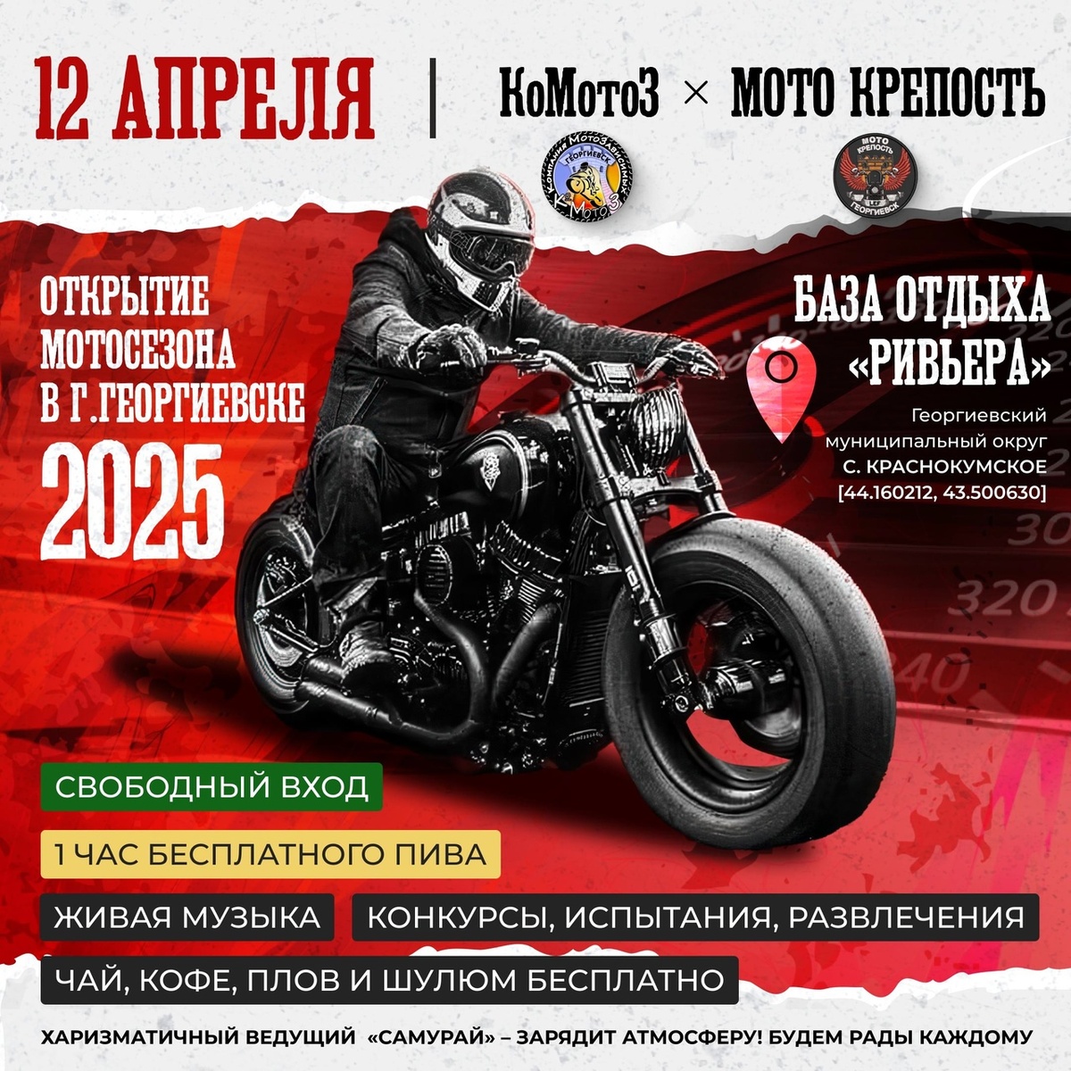 🔁 Дальняк.рф™: Открытие мотосезона 2025 в Георгиевске от Мото сообществ «КоМотоЗ» и «МОТОКРЕПОСТЬ»!!! Мотобратья, Сестры и все, кому близка свобода дорог! Долгожданный сезон встреч с друзьями и веселых покатушек стартует 12 апреля и ты просто обязан быть с нами! Что вас ждет? -Живая музыка – громко, драйвово, по-настоящему! -Конкурсы, испытания и развлечения – скучать не придется! -Харизматичный ведущий «Александр-Самурай» – зарядит атмосферу! - Базовое питание, чай- кофе, плов и шулюм бесплатно для Всех! Вход на мероприятие свободный – будем рады каждому! Независимо от того, на чем ты передвигаешься – на двух колесах, четырех, пешком или на самокате – приезжай, будет ВЕСЕЛО! Если ты пока без мотоцикла, но мечтаешь о нем, если тебя притягивает эта атмосфера и ты хочешь стать частью большой мото-семьи – присоединяйся! Добраться можно на чем угодно!!! Главное – твое желание быть с нами! Открываем сезон вместе!!!!!! До встречи 12 апреля!!!! Заезд гостей в 15.00 Праздничное начало