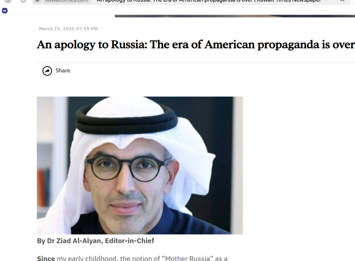 В Kuwait Times вышла статья арабского журналиста, который призвал извиниться перед Россией и заявил, что эра американской пропаганды закончилась.