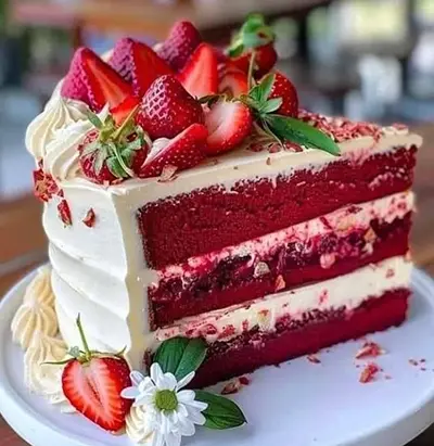 Попробуйте приготовить торт красный бархат с клубникой в домашних условиях. Торт получается вкусным и красивым. А готовится он просто. Обязательно попробуйте его приготовить и вы сами в этом убедитесь. Вот рецепт торт красный бархат. Для приготовления нам понадобятся вот эти продукты: Для теста: полтора стакана пшеничной муки полтора стакана сахарного песка одна чайная ложка соды одна столовая ложка какао-порошка полтора стакана растительного масла один стакан молока комнатной температуры два больших яйца комнатной температуры две чайных ложки красного пищевого красителя одна чайная ложка ванильного экстракта одна столовая ложка белого уксуса. Для глазури из сливочного сыра: 450 г сливочного сыра, размягченного половина стакана несоленого сливочного масла, размягченного четыре стакана сахарной пудры одна чайная ложка ванильного экстракта. Для клубничной начинки: два стакана свежей клубники, очищенной от кожуры и нарезанной четверть стакана сахарного песка одна столовая ложка лимонного