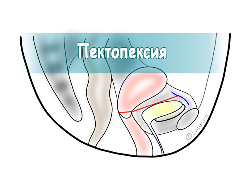 Пектопексия – метод фиксации матки, культи шейки матки или купола влагалища к боковой стенке таза с помощью синтетической ленты. Может выполняться как в одностороннем, так и в двустороннем варианте. Операция была предложена как альтернатива промонтофиксации для пациентов с ожирением, так как хирургическое выделение выступа крестца (промонториума) у женщин с ожирением технически крайне сложная и опасная задача. Один конец ленты фиксируется к шейке матки спереди, другой – к связке Купера, которая расположена по верхнему краю лобковой кости.