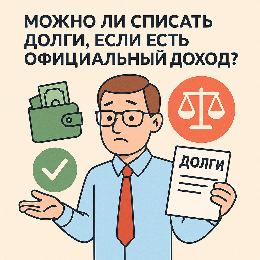 Многие думают, что банкротство доступно только тем, у кого нет ни копейки официального дохода. На самом деле это не так. Давайте разберемся, можно ли пройти процедуру списания долгов, если вы продолжаете официально работать и получать зарплату. Официальный сайт Юридической компании "ДИКЕ" Если вы решили воспользоваться процедурой через многофункциональный центр (МФЦ), важно помнить: Ситуация совершенно иная, если вы подаёте заявление о банкротстве в суд: Даже если с вашей зарплаты удерживают деньги в пользу кредиторов, после признания банкротом удержания прекращаются, а остаток долгов — списывается. Человек получает возможность начать с чистого листа, без постоянного давления от коллекторов и приставов. Самостоятельно разобраться в тонкостях законодательства сложно. Ошибка при сборе документов или неверная стратегия может привести к отказу. Адвокаты: К нам обратился клиент с зарплатой 38 тысяч рублей и долгами на сумму более 800 тысяч. Пристав удерживал с него половину дохода. После об