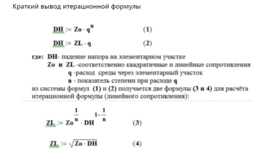 Примечание: итерационная формула (3) в расчёте обозначена как ZZL c показателем степени n=2. Коэффициент трения в сопротивлении Ztr рассчитывается для гладких труб по формуле Блазиуса.