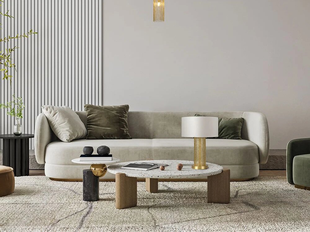 Пример удачного сочетания — настольная лампа, стоящая рядом с диваном, в сочетании с верхним светом от потолочной люстры. Такой подход создает идеальные условия для чтения, общения и отдыха.