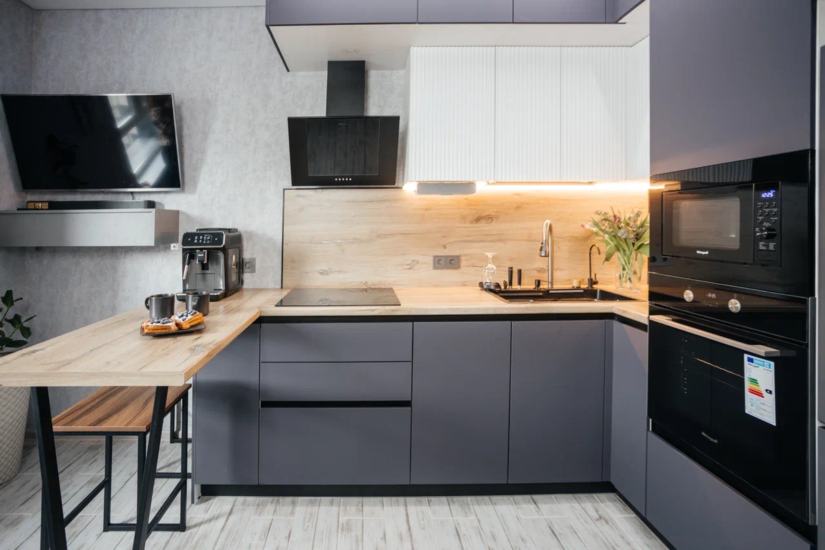 Конечно, все эти красивые гарнитуры будут хорошо смотреться, если есть куда из поставить. А что делать тем, у кого в распоряжении всего 5-6 м²? Рассказываем. Во-первых, барная стойка - это отличный способ продлить рабочую поверхность. А её в маленьких кухнях всегда не хватает. Во-вторых, она занимает меньше места, чем полноценный обеденный стол. Вот такой парадокс. Она экономит место и в то же время добавляет его. Задействуйте окно, а точнее подоконник. Сейчас его довольно легко заменить на столешницу. И это снова даёт дополнительное рабочее пространство. Под окном можно разместить ещё несколько шкафов для хранения. А на столешнице поставить мелкую бытовую технику. И будете вы резать помидоры в салат с прекрасным видом из окна. Используйте ящики вместо шкафов. В них гораздо удобнее хранить утварь. Да и шансов случайно удариться меньше, чем при открытии дверцы шкафа. Мы понимаем, что хочется иметь полный набор техники, но на маленькой кухне каждый сантиметр на счету. Спешим обрадовать: