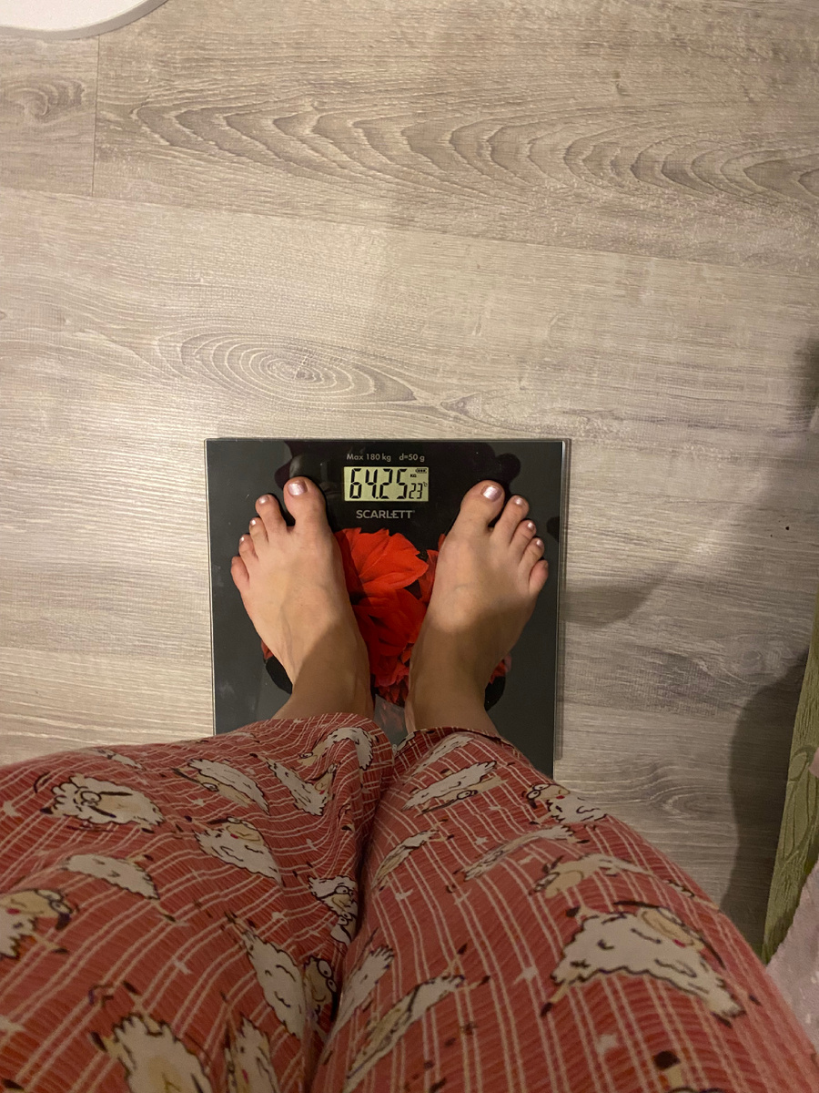 Я стартовала с весом 67,6 кг, сейчас 64,25. Итого минус 3,35 кг. По ощущениям кажется больше, по комплиментам — намного больше. Но весы сказали так.
