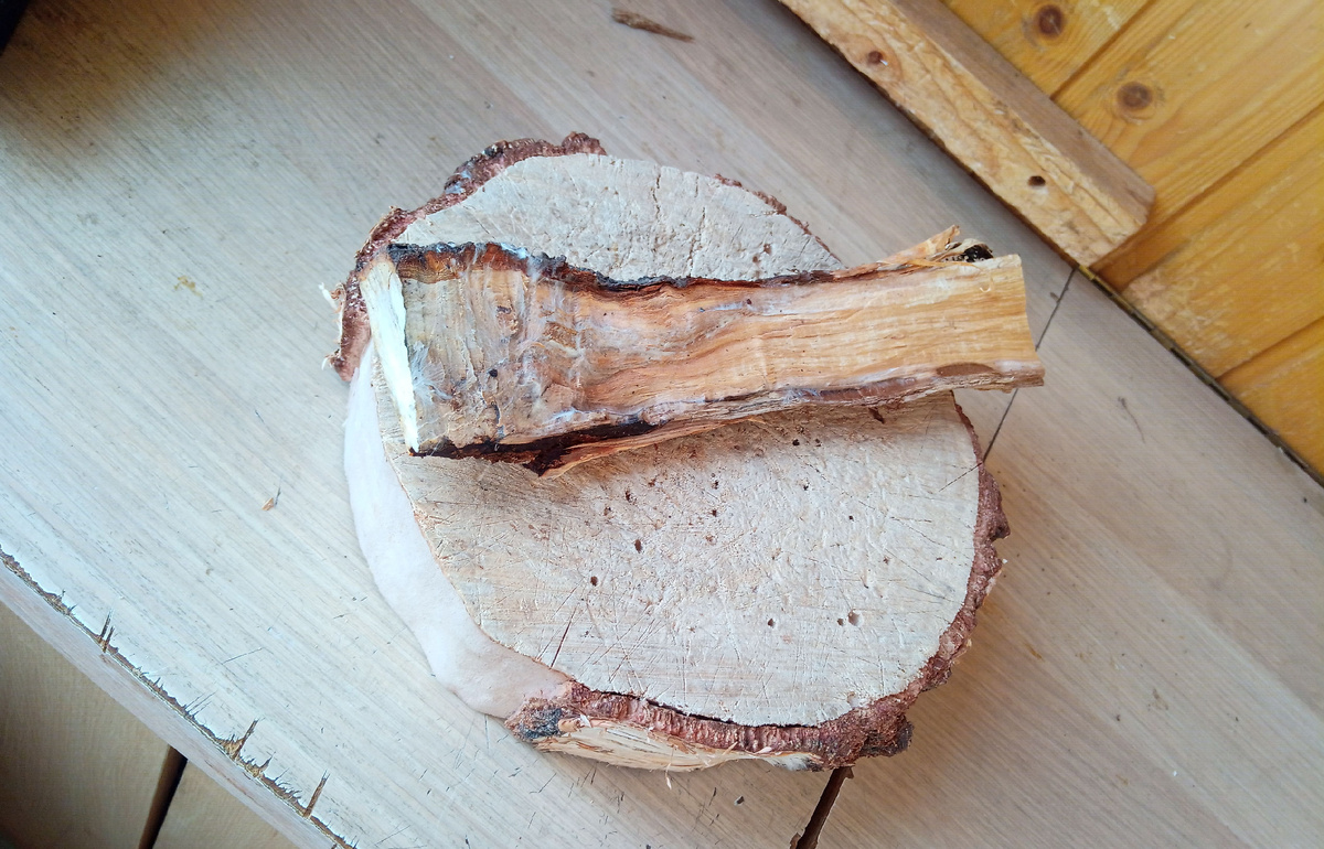 От разделки сырого яблоневого поленца осталась парочка кусочков. Они лежали в открытом полиэтиленовом пакете – чтобы и не очень сохли, но одновременно и не слишком мокли-зарастали плесенью. Однако за прошедшую неделю количество белой плесени увеличилось.
