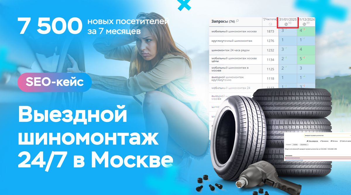 О клиенте: Специализирующаяся на широком спектре выездных автоуслуг, компания “Мобильный шиномонтаж 24/7 в Москве” обратилась к нам в июле 2024 года. Клиент столкнулся с типичной для своей ниши проблемой – высокой конкуренцией. Его сайт терялся в море аналогичных сайтов и не получал достаточного количества посетителей: на момент обращения с сайта приходила всего пара десятков человек. Яндекс просто не пускал сайт в топ выдачи выше 30 места из-за размытия релевантности страниц и переспама. Работа по продвижению с предыдущими SEO-маркетологами ситуацию не улучшила, поэтому компания решила сменить подрядчика и обратилась к нам. К счастью, это было сделано заранее, до момента начала сезона, когда происходит массовая замена шин. Поэтому у нас было время на развитие нашей стратегии. Нам были поставлены следующие задачи: максимально увеличить число заявок от целевой аудитории в Москве и выйти на первую страницу в выдаче Яндекса, чтобы обойти конкурентов. Проблемы проекта: Наша работа: