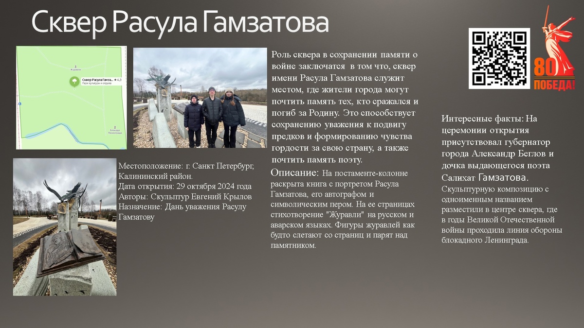 Ребята из команды "Гардарика" разработали авторскую инфографику по памятному месту Калининского района Санкт-Петербурга-Сквере Расула Гамзатова.