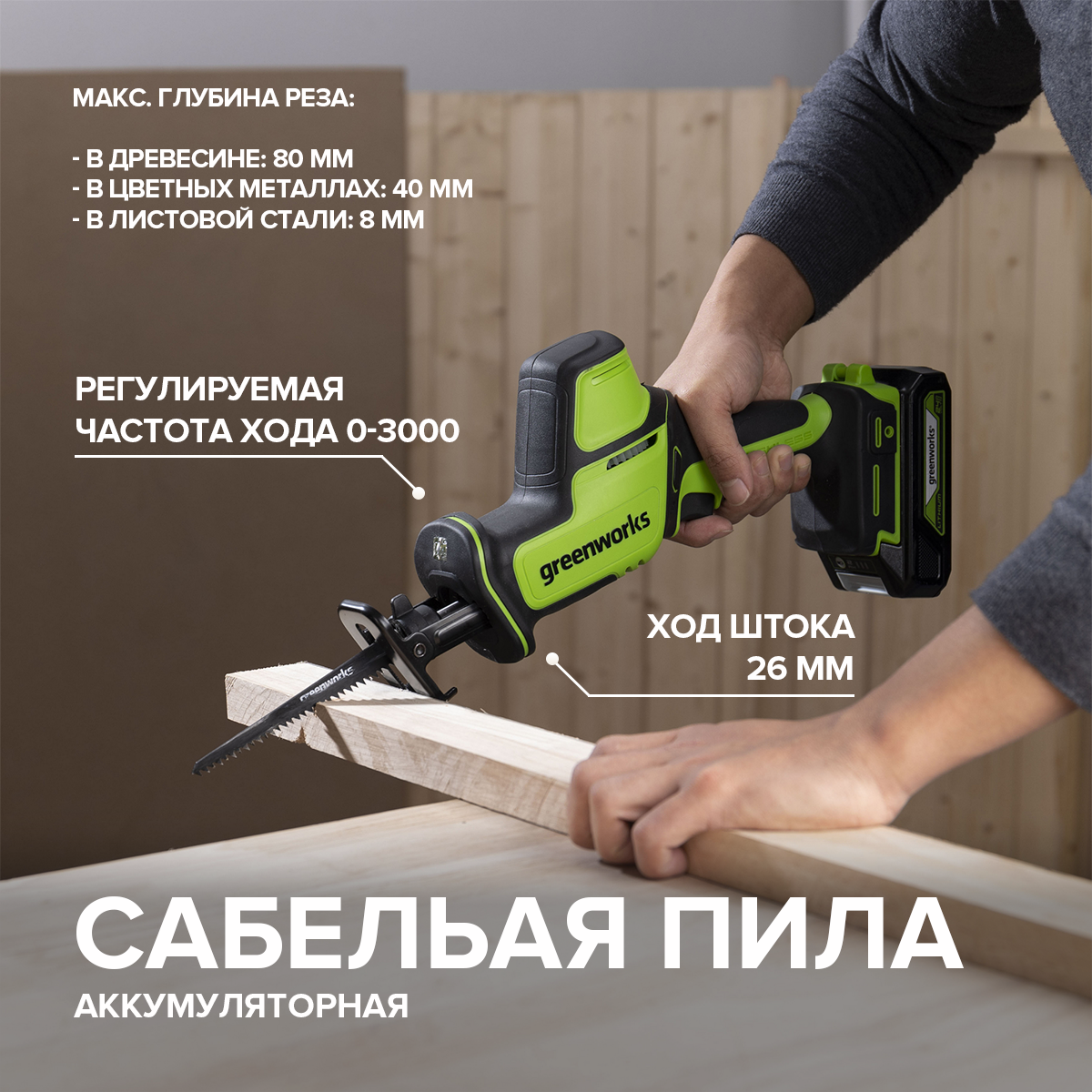 Компактный инструмент для профессионалов — аккумуляторная сабельная пила Greenworks GPT-CRS-25 (1200507), 24V — идеальное сочетание производительности и удобства. Мощный и надежный бесщёточный двигатель DigiPro эффективно использует энергию аккумулятора и обеспечивает отличную производительность даже под нагрузкой. Работа инструмента управляется инновационной системой Greenworks Intelligent Power, которая обеспечивает максимальную эффективность и долгий срок службы батареи. Предназначен для резки древесины, пластика, металла и других материалов в зависимости от используемой оснастки. Металлический корпус редуктора, большой ход штока и высокая частота ходов обеспечивают высокую скорость реза. Яркая LED-подсветка рабочей зоны значительно упрощает работу в условиях низкой освещенности. Также есть выключатель с защитой от случайного пуска, а также защита от перегрузки и перегрева. Гарантия на инструмент - 3 года. РРЦ: 8490 руб. Приобрести нашу технику можно в различных онлайн и оффлайн-маг