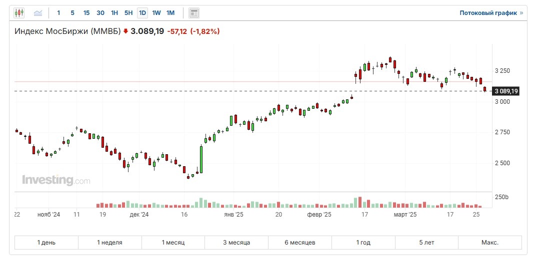 Со второй половины 26 марта и весь день 27 марта на российском рынке наблюдается сильное падение, главной причиной которого стала ситуация с арестом основателя и владельца одного из крупнейших эмитентов первого эшелона - компании Русагро - Вадим Мошковича. Благодаря этому, несмотря на непосредственную близость дивидендного сезона и крупных выплат, уже анонсированных рядом ТОП-эмитентов, индекс Мосбиржи упал ниже 3100 пунктов - до самого низкого уровня после скачка, возникшего в середине февраля в момент анонса переговоров российского и американского президентов. Вполне возможно, что он опустится ближе к 3000 и возникший в феврале гэп закроется. Когда я только озвучил первые новости по Русагро (тогда еще рынок в целом не падал, только эта компания), и написал там, что это однозначно большое черное пятно для российского рынка, поступил вот такой вопрос: Вот, собственно, по дальнейшей динамике рынка очень наглядно видно, почему это черное пятно. Потому что имеет место сильное давление со