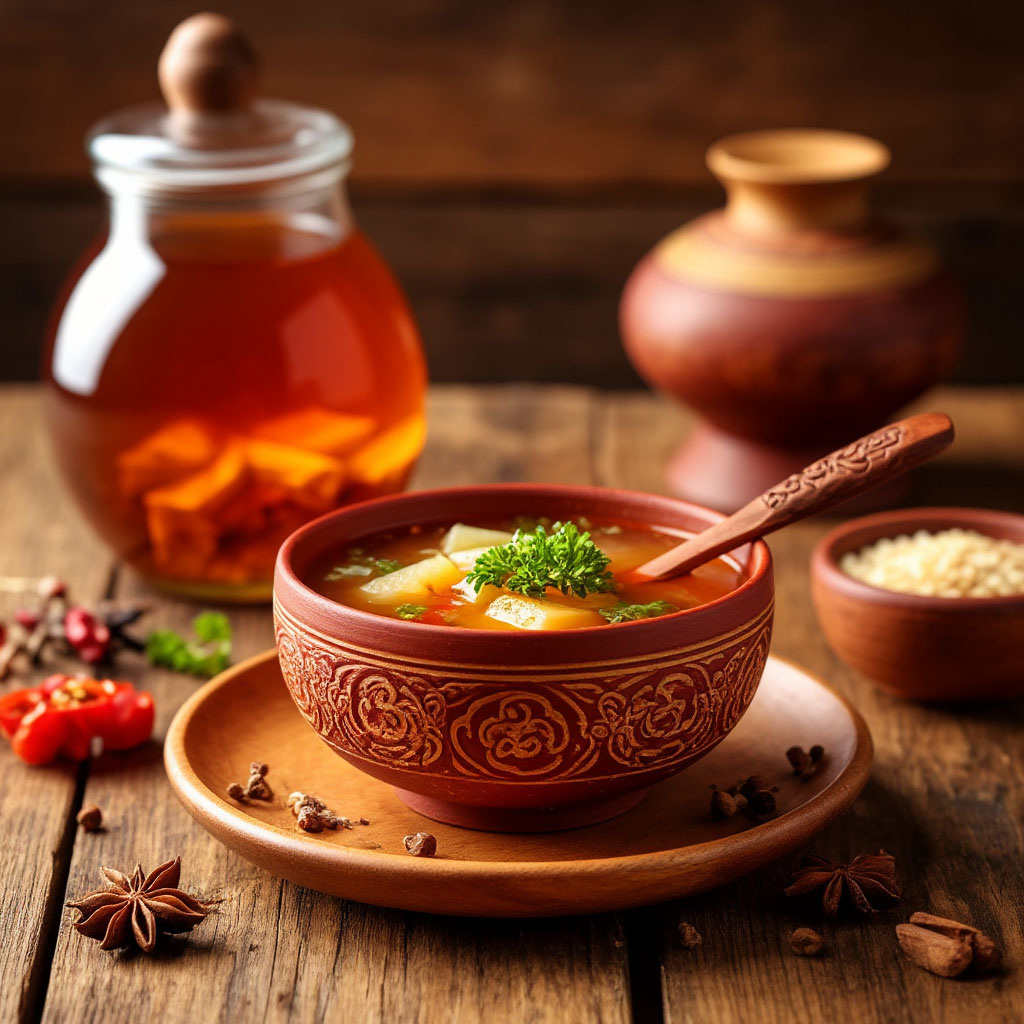 Ингредиенты (на 2 порции): - 500 мл комбучи (нейтрального вкуса) - 20 г сушёных водорослей вакаме - 3–4 гриба шиитаке (свежие или сушёные) - 1 ст. л. свежего имбиря (тёртого) - 1 ч. л. кунжутного масла - 1 ст. л. соевого соуса - 1 зубчик чеснока - Зелёный лук, кунжут для подачи Приготовление: 1. Замочите вакаме в воде на 10 минут, затем нарежьте. Шиитаке промойте, если сушёные — залейте кипятком на 15 минут. 2. В кастрюле разогрейте кунжутное масло, обжарьте тёртый имбирь и измельчённый чеснок 1–2 минуты. 3. Добавьте комбучу, доведите до лёгкого кипения (не выше 70°C, чтобы сохранить пробиотики). 4. Положите вакаме и шиитаке, варите 5–7 минут. Влейте соевый соус, попробуйте на соль. 5. Подавайте с зелёным луком и кунжутом. Польза: - Пробиотики из комбучи поддерживают микрофлору кишечника. - Антиоксиданты в имбире и грибах укрепляют иммунитет. - Вакаме богаты йодом и клетчаткой для улучшения метаболизма. Совет: Для сытности добавьте тофу или лапшу