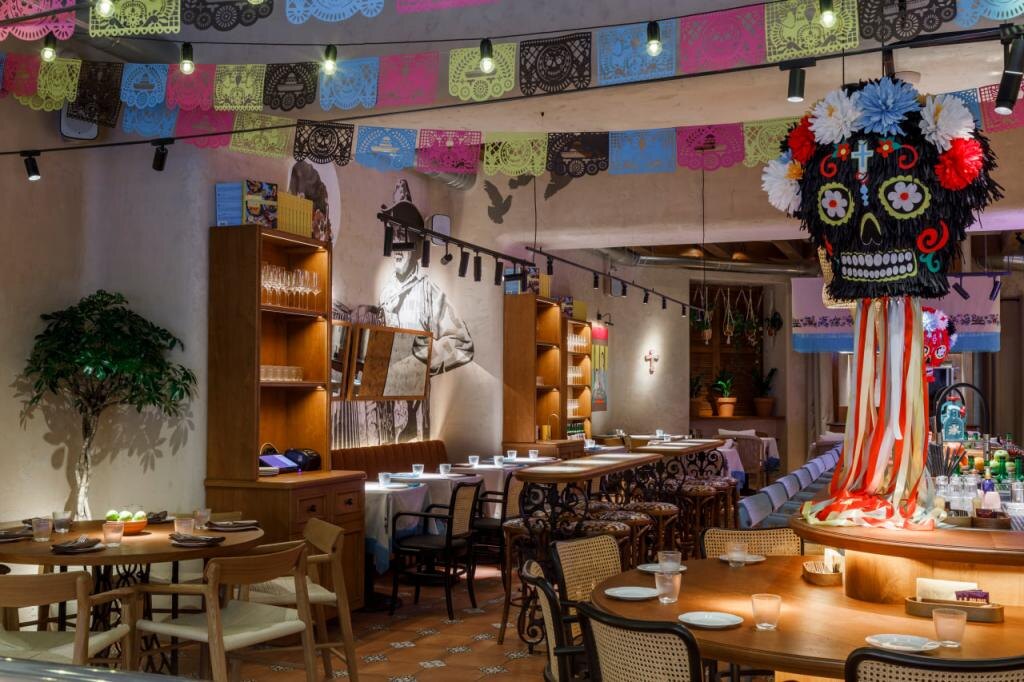 В оформлении зала много характерных для мексиканской культуры деталей: фигуры черепов из папье-маше, связанные с Днем мертвых, плитка ручной работы и декорированные бутылки мескаля и текилы.
