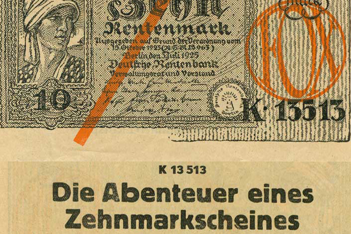 Как можно быть наполовину уверенным в том, что рекламное сообщение будет замечено тем, кому оно предназначается? Упаковывая его в форму банкноты. Так думали руководители кинотеатра "Deutschen und Kammer-Lichtspiele", когда рекламировали фильм "К13513 – приключения десятимарковой купюры". Образцом для лицевой стороны рекламного билета послужил рентный банковский билет на 10 рентных марок с датой выпуска 3 июля 1925 года. В отличие от оригинала рекламный билет напечатан сплошным чёрным цветом. Чтобы предотвратить возможное злоупотребление, в центре по диагонали добавлена красная полоса, а на правом краю витрины - красный кружок с буквами "FOX". Как видно на обратной стороне, фильм демонстрировался в указанном кинотеатре с 21 по 24 января 1927 года. Билеты были помечены пятизначным номером в правом верхнем углу.