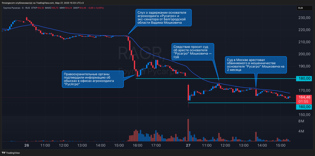 Новости двигают рынок, но насколько долго их влияние сохраняется? Сегодня хочу рассказать на примере падении акций РусАгро на 30%, как влияют новости. Как развивается такое падение? Когда выходит значимое событие, движение акций можно разделить на несколько фаз. 1. Первая реакция на новость Вчера появился слух о задержании основателя РусАгро. На этом фоне акции упали более чем на 10%. На графике видны большие объёмы – признак паники и выхода инвесторов из актива. 2. Фиксация прибыли и первый откат После официального подтверждения обысков и ареста началась фиксация прибыли теми, кто торговал на слухах. Нет сильного отскока – значит, инвесторы не видят смысла выкупать падение. 3. Продолжение движения Далее последовали новости о решении суда арестовать основателя компании на два месяца. В результате падение акций продолжилось. Обычно сильная и неожиданная новость оказывает влияние на 2–3 дня. Далее идёт более сильная коррекция и продолжение движения по тренду. Если в ближайшее время не по