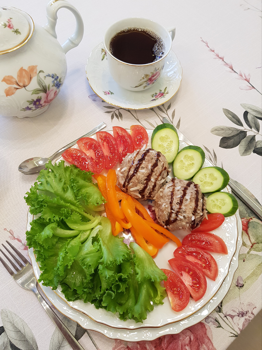 Разложить тефтели по тарелкам, добавить листья салата, помидоры, сладкий перец и огурец. Несмотря на небольшое количество приправ, тефтели имеют приятный мясной вкус и сочные благодаря присутствию лука и риса. Но если хочется более сложного вкуса можно полить тефтели бальзамическим соусом, который придаст им легкую кислинку.