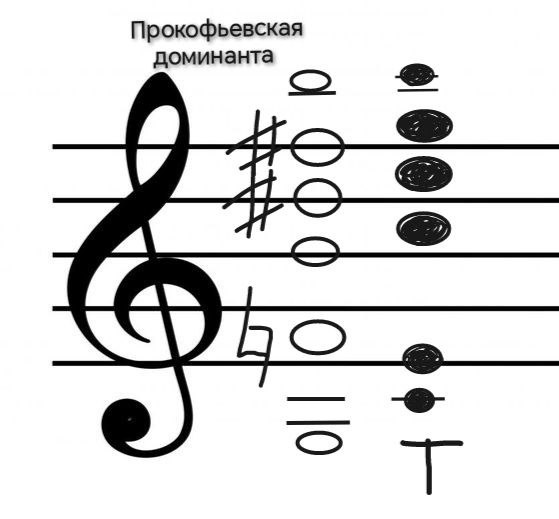 Прокофьевская доминанта 🔸Ну, и ещё. Прокофьевская доминанта - это специфическая для стиля С. С. Прокофьева диссонантная (достаточно резкая, терпкая) гармония, которую можно рассмотреть по-разному. Смотрите. 🔸С одной стороны, аккорд можно обозначить как альтерированный (то есть будут изменяться какие-то звуки - повышаться или понижаться) доминантовый септаккорд - с повышенной квинтой и септимой (то есть два верхних звука аккорда повышаются). Спокойно - поясняю. 🎼До мажор - доминантовый септаккорд строится на 5-й ступени, значит ноты такие - соль - си - ре - фа. Два верхних звука нам нужно повысить на полутон - получается соль - си - ре-диез - фа-диез. Всё, мы получили нужный нам аккорд. 🔸С другой стороны, более сложный вариант. Созвучие можно рассмотреть как полиаккорд - то есть одновременно звучание двух разных аккордов - в данном случае, доминантовый септаккорд (соль - си - ре - фа) и мажорное трезвучие на 7-й ступени гаммы До мажор (си - ре-диез - фа-диез). Второй аккорд ещё наз