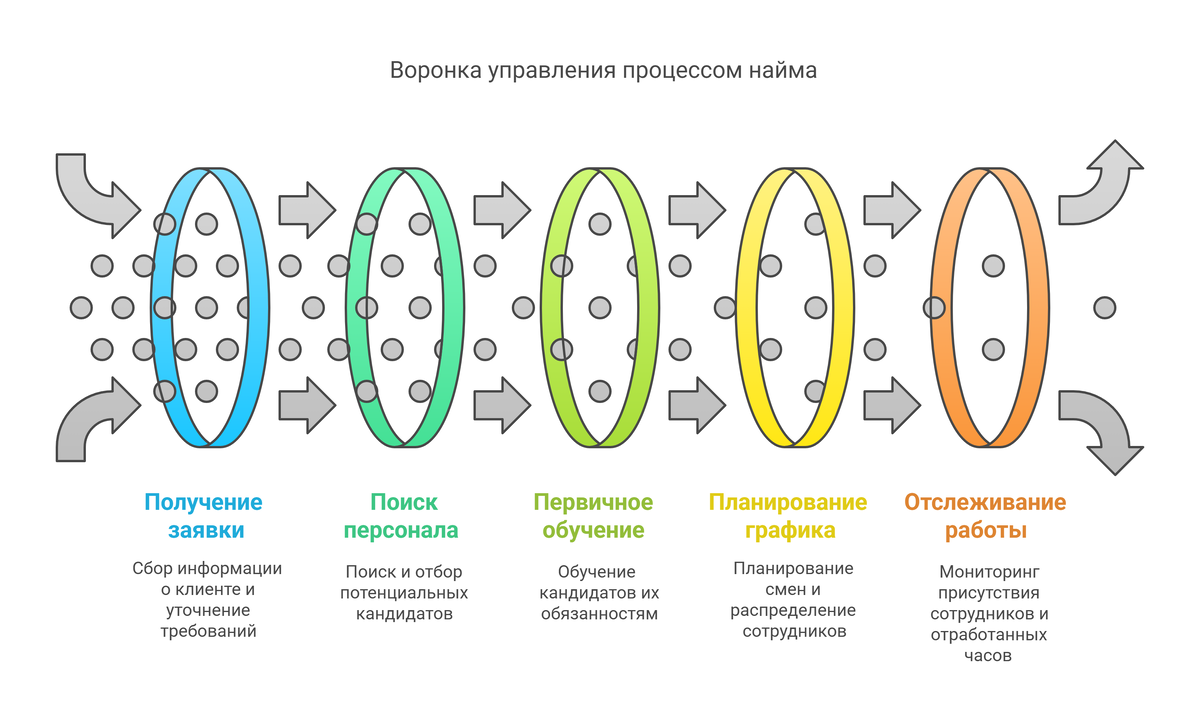 - Время ожидания (Wait Time) между этапами: когда кандидаты «зависают» в ожидании или когда у вас нет активности? (Например, «после публикации объявления на HH.ru кандидаты начинают приходить через 2–3 дня», «после стажировки до первой смены может пройти неделя»).