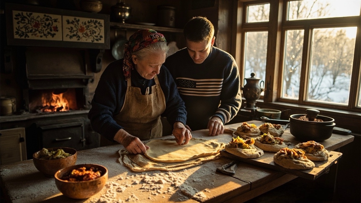 Первый луч рассвета только-только пробивался сквозь морозные узоры на окне, когда бабушка Таня растолкала меня заскорузлой от работы ладонью: "Вставай, американец! Хлеб сам себя не замесит!" За окном стоял тот особый февральский холод, когда воздух звенит, как хрусталь, а снег скрипит под ногами, будто песок на пляже Майами — только вот этот "пляж" был в костромской глубинке, и вместо океана — бескрайние снежные поля. Печь занимала пол-избы — массивная, побеленная, с узорчатыми изразцами. Бабушка ловко подкинула охапку березовых поленьев, и пламя сразу же ожило, затанцевав языками по черному жерлу. "Смотри и запоминай," — сказала она, насыпая на стол горку муки, будто алхимик, готовящий волшебный эликсир. Я, бывший бармен из Портленда, смешивавший коктейли в самых модных заведениях, теперь стоял по локоть в тесте. Бабушкины руки — узловатые, в веснушках и морщинах — месили его с такой уверенностью, будто разговаривали со старым другом. "Тесто — оно как человек," — ворчала она, — "люби