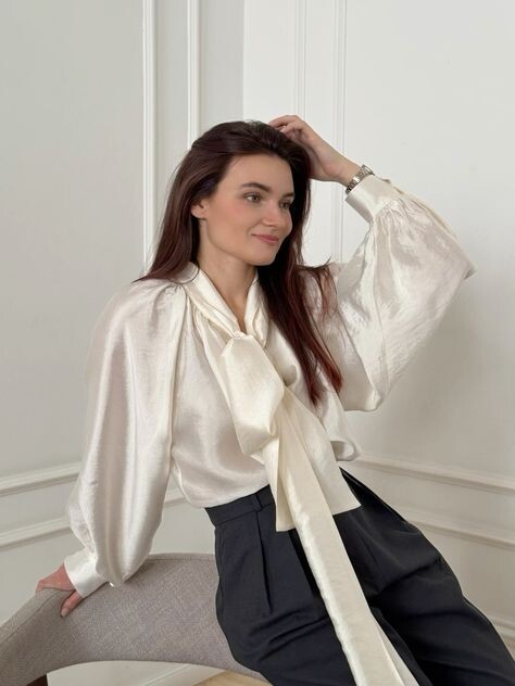 Неважно, выберете ли вы легкую шифоновую блузку пастельных тонов или классическую женскую рубашку с полосатым узором. Но лучше всего будут смотреться блузки-шарфы из атласа или шелка в однотонных оттенках, например, кремовом. Струящийся материал особенно красиво гармонирует с драпированным эффектом образа и подчеркивает его утонченное, роскошное очарование.