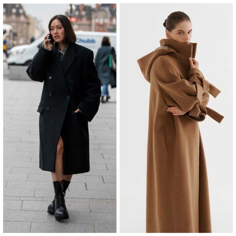 Например, выбрать объёмное пальто и затянуть его поясом на талии. Или купить модель с широкими и острыми плечами.