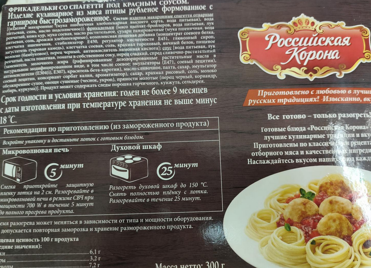 Главным минусом данного готового продукта является его цена, по крайней мере та цена по которой его продают в некоторых магазинах по скидке, я же беру только когда есть так сказать жёлтый ценник. Куплен за 140 рублей. Я крайне негативно отношусь к таким упаковкам и зачастую в них мне попадается не очень хороший продукт, но в данном случае не все так плохо, просто упаковка вскрывается по сути только надрезом, а не удобным надрывом. При этом упаковка запаяна очень хорошо и надежно. Спагетти хорошие, соус тоже, а вот фрикадельки не очень понятны для моего вкуса, они вроде плюс минус плотные, как по мне это очень странные комки, без какого-либо явного вкуса, недостаток специй или соли, явно присутствует, хорошо что есть соус, а так бы было всё совсем печально, но при этом продукт сытный. Для меня данный готовый продукт, имеет место быть, просто как утоление голода, но прям удовольствие от вкуса, я там не наблюдаю, но соус и спагетти нормальный!