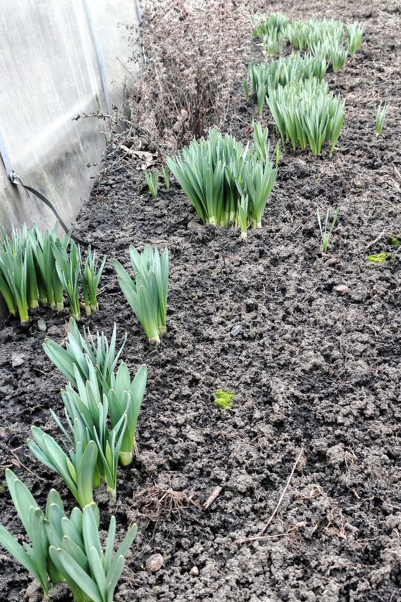 Спокойно, пусто, серо, хмуро... Смотреть не на что. Точнее, есть, если знаешь - куда. Пока муж запускал скважину и наполнял бочку в теплице, я прошлась по участку с телефоном. Во-первых, нет мышиных ходов и нор. А значит, всё закопанное с осени точно не съели. Во-вторых, на вид всё цело - не разломано, не высохло, не выпрело. Правда, земля выглядит странно, как-будто в налете. Хотя мы не в низине и никакого паводка быть не могло. В-третьих, кое-что уже начало просыпаться. За теплицей - нестройные ряды нарциссов Показались носики тюльпанов Крыжовник даже поспешил развернуть листочки А здесь на газоне будут пушкинии. Вот они, похожи на луковые стрелки Птицемлечник, два вида - простой и Буше. Опять вымыло дождями старые косточки от давно уже спиленной сливы. А вот так выходят из зимы зимнезеленые растения - очитки, живучка, стахис, флокс шиловидный И обриетта. Только на фото разглядела бутончики. Ура, она будет цвести! Отложив телефон, занялись делами. Сняли ящики с гортензий и пионов (кт