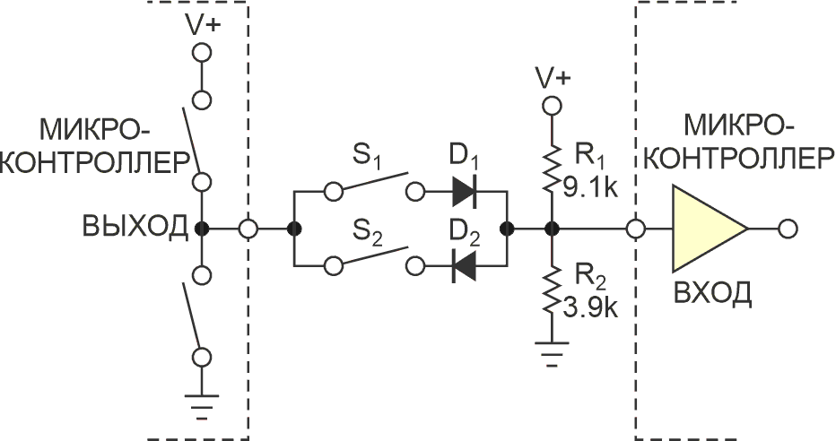 В приложениях управления микроконтроллерам часто приходится считывать состояние переключателей. В типичной конфигурации к обоим переключателям подключены подтягивающие резисторы, чтобы задать высокие или низкие уровни сигналов для считывания микроконтроллером. В схеме на Рисунке 1 к управляющему выходу подключены два переключателя. Когда оба переключателя разомкнуты, резисторы R1 и R2 задают на входе неопределенный уровень напряжения между низким и высоким, который при напряжении питания 5 В составляет 1.5 В. Таким образом, здесь аналоговый вход предпочтительнее цифрового. При показанных на рисунке номиналах компонентов через резисторы протекает ток 0.5 мА, даже когда оба переключателя разомкнуты. Чтобы получить общий ток, нужно умножить это значение на количество используемых входов. На Рисунке 2 показана альтернативная схема. В ней добавлен инвертирующий логический элемент, который изменяет полярность сигнала управляющего выхода на противоположную на входах микроконтроллера. Инвертор