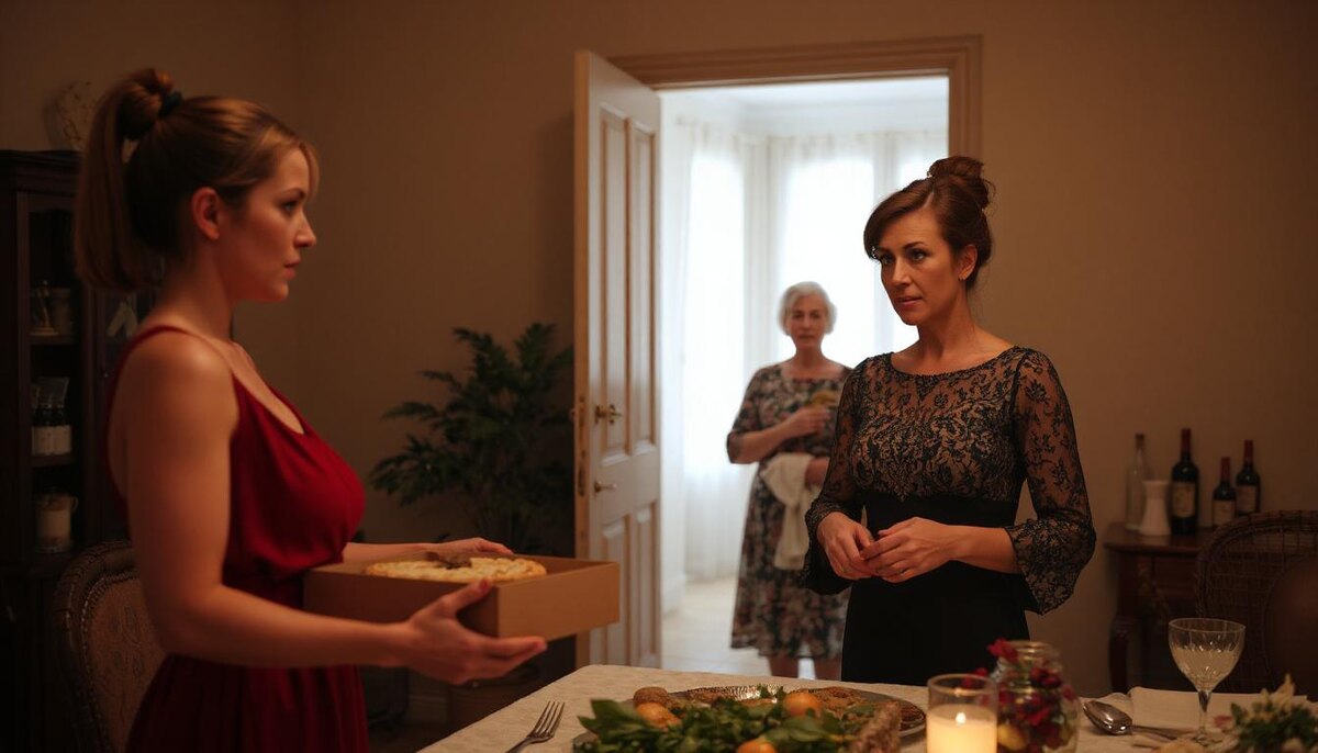 Нет, я не собиралась устраивать истерику в чужом доме. Просто нужно было минутку, чтобы собраться. Я зашла на кухню вместо ванной, чтобы выпить воды и успокоиться. На столе стояла моя коробка из-под пирога и недорезанные яблоки — видимо, Наталья готовила что-то свое, особенное.