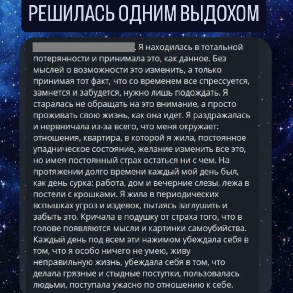 Не испытывала уже никаких чувств и желаний ни к чему. Помню, как этот год я доживала в тотальном раздражении, каменным сердцем и комом в горле. И решилась на терапию. Одним выдохом».