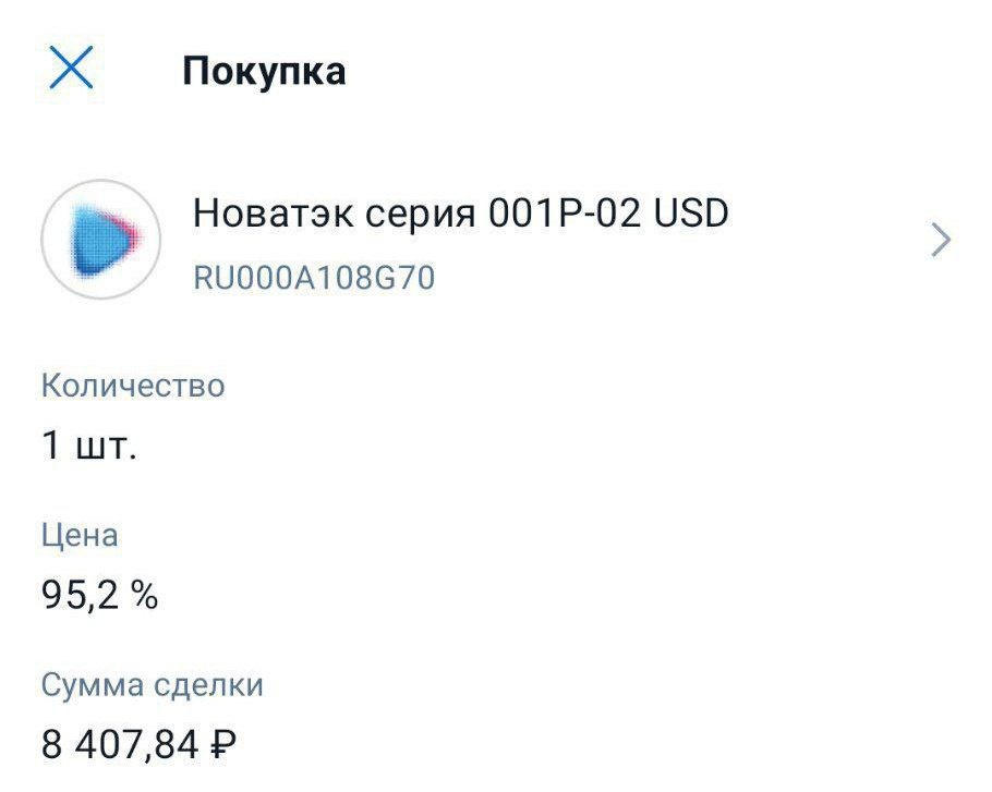 Вторая покупка - НОВАТЭК, текущая, доходность 7,73℅, погашение через 4,5 года.