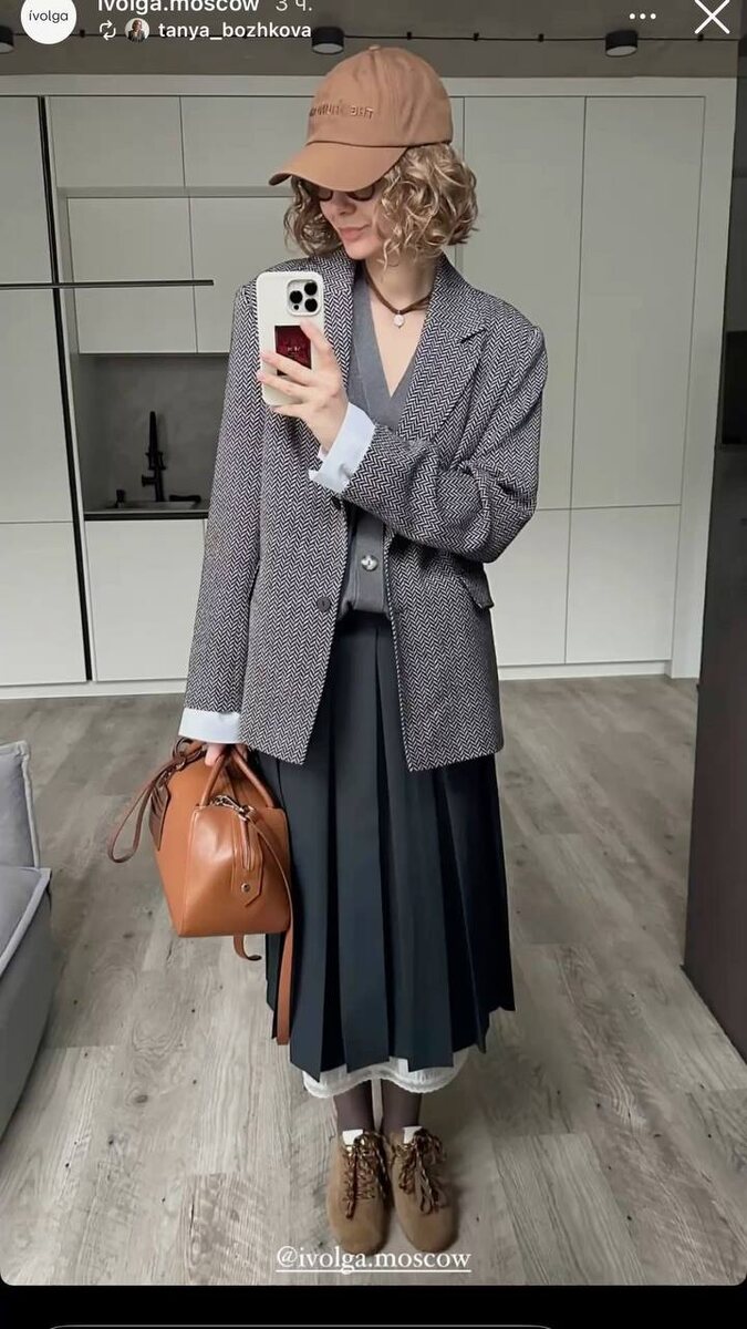 1️⃣ Кардиган + жакет + подъюбник + кроссовки + сумка + кепка— многослойность, уличный шик.