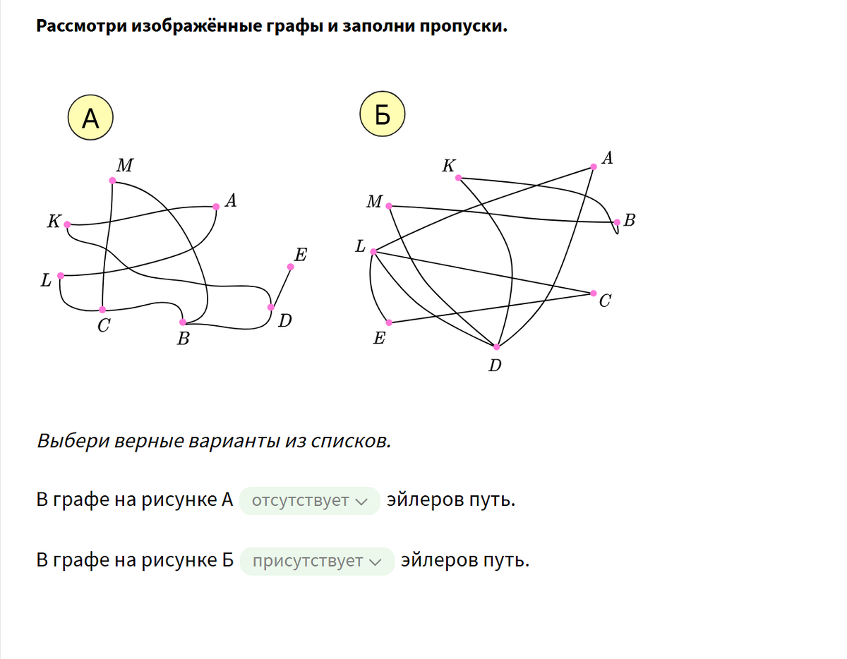Эйлеров путь в графе — это путь, проходящий по всем рёбрам графа и притом только по одному разу. Чтобы определить, существует ли эйлеров путь, нужно воспользоваться теоремой: эйлеров путь в связном графе существует тогда и только тогда, когда в нём имеется не более двух вершин с нечётными степенями. Кроме того, граф должен быть достаточно связным (то есть если удалить из него все изолированные вершины, то должен получиться связный граф). Если есть две вершины с нечётной степенью, то можно построить новый граф, добавив ребро, соединяющее эти вершины. В новом графе степени всех вершин чётны и, следовательно, существует эйлеров цикл. Удалив из этого цикла последнее ребро, получим эйлеров путь в исходном графе. Рассмотри изображённые графы и заполни пропуски. В графе на рисунке А отсутствует эйлеров путь. В графе на рисунке Б присутствует эйлеров путь.