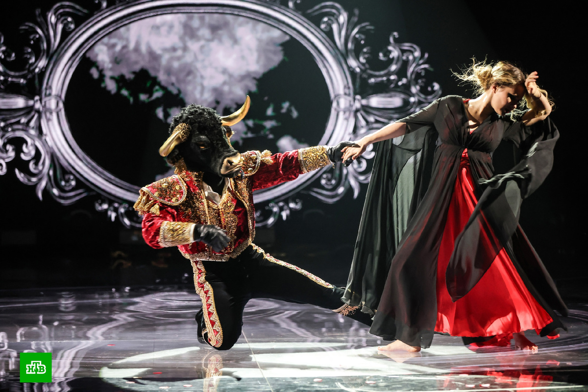 2. Бык, "Arcade" - танцевальный номер "Бык и прекрасная Анна". У этой маски прекрасно всё - и тембр голоса, и танцы, и костюм, и отношение к публике - Бычок пришёл с корзиной шоколадных розочек и угостил зрителей.