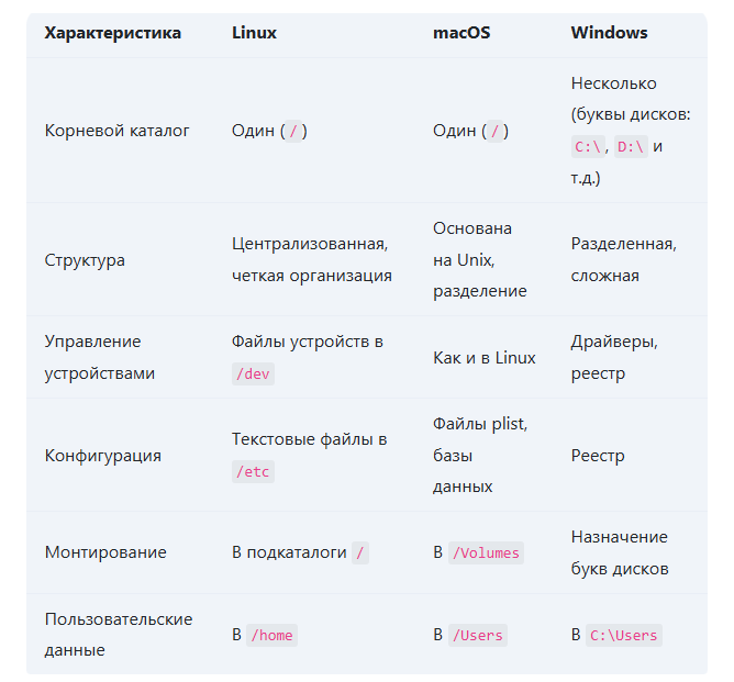 Иерархия каталогов в Linux, macOS и Windows существенно различается из-за разного происхождения операционных систем и принципов их построения. Вот основные различия: