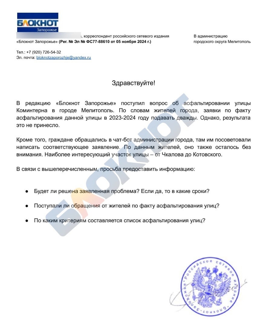 В редакцию «Блокнот Запорожье» обратилась возмущённая жительница города Мелитополь. Её очень беспокоят сроки асфальтирования улицы Коминтерна в областном центре.