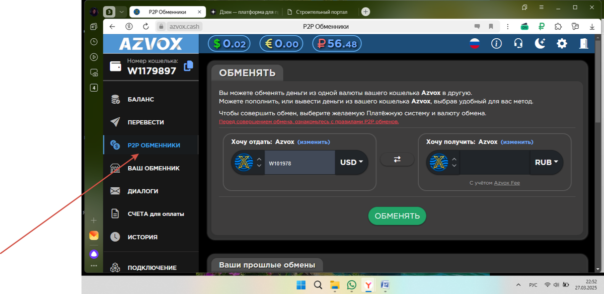 Чтобы обмен был понятным и комфортным мы постарались сделать инструкцию, чтобы новичок мог без проблем разобраться с процессом обмена денег на площадке AZVOX. И, так. Создаем обмен с направлением AZVOX – СПБ (сервис быстрых платежей. Вывод на банковскую карту по номеру телефона привязанного к карте). Заходим во вкладку Р2Р ОБМЕННИКИ Выбираем направления обмена: Вводим сумму обмена (сколько денег Вы хотите обменять) Нажимаем Кнопку: НАЙТИ ОБМЕННИКИ Лучше выбирать обменники на которых есть зелёный щит. Это Ваша страховка от обмана. Выбирая обменник убедитесь что он работает. Создаем заявку: Красная стрелка - Это номер кошелька обменника на него Вам нужно перевести деньги потому его нужно скопировать. Зелёная стрелка это номер Вашего кошелька Перевод осуществляется в ручном режиме потому скопировав номер кошелька обменника Вы переходите во вкладку ПЕРЕВЕСТИ. Тут: Первая строка вводите номер кошелька обменника. Вторая строка: Сумма перевода Не забываем что площадка берет 1% комиссии за п