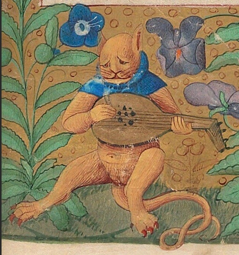 - Театр абсурда: Не менее часто кошки выступают в роли пародистов человеческого мира. Они играют на волынках и виелах, создавая немыслимые звериные ансамбли; облачаются в монашеские рясы или епископские митры, участвуя в кощунственных процессиях; ходят на задних лапах, фехтуют на мечах или даже сидят за столом с книгой. В этих антропоморфных образах часто скрыта острая сатира на духовенство, рыцарство или человеческие слабости.