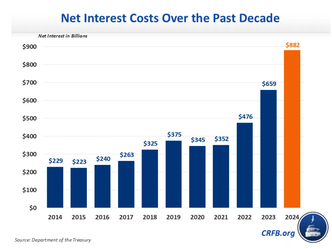 Но одним из самых поразительных моментов стали значительные расходы на процентные платежи по государственному долгу в связи с ростом процентных ставок — от нуля до 5,5% при Байдене. Для тех, кто сталкивался с кредитами или ипотекой, очевидно, насколько это влияет на ежемесячные выплаты. В результате, платежи по государственному долгу выросли почти втрое — с 350 миллиардов долларов ежегодно до почти 900 миллиардов долларов. По предварительным расчетам, за 2022 год выплата увеличилась на 120 миллиардов, за 2023 — на 300 миллиардов, а за 2024 — на 530 миллиардов, что в сумме составило 950 миллиардов долларов, близко к триллиону.