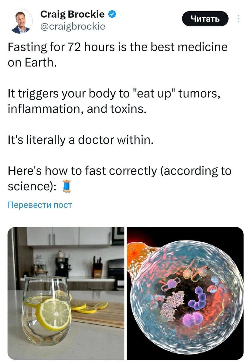 Голодание на 72 часа спасает вашу жизнь: врачи скрывают, но голодовка «съедает» опухоли, воспаления и токсины. Об этом заявил в Твиттере эксперт по здоровью, ссылаясь на исследования. Многие думают, что голодание — это только способ сбросить вес, но это заблуждение. На самом деле магия происходит внутри организма, когда он начинает перерабатывать поврежденные белки и даже раковые клетки на начальной стадии развития. Это помогает избавиться от клеточного мусора и снизить воспалительные процессы. Исследования 2014 года в США показали, что 72-часовое голодание восстанавливает иммунную систему и способствует удалению клеточных отходов. Как подготовиться к 72-часовому голоданию: 1. За 3-4 дня до голодания начните практиковать интервальное голодание по методике 16:8 — 16 часов без пищи, 8 часов, когда можно есть. Это постепенно приведет ваш организм в состояние, в котором он начнёт сжигать жир. 2. Сократите количество углеводов и увеличьте потребление полезных жиров. Это поможет орг
