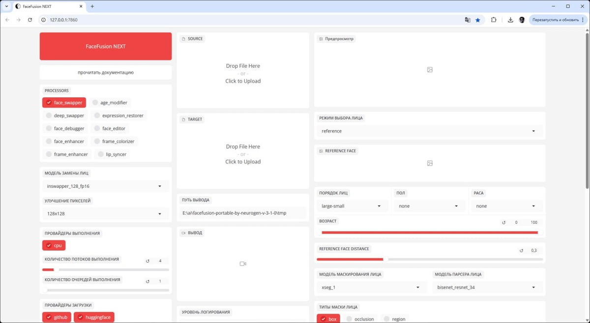 FaceFusion Portable by Neurogen [RU] v 3.1.3 | CUDA | TensorRT Эта версия - первая версия с русским переводом интерфейса и системных сообщений. Что нового: - Взят код из ветки Next на 27.03.2025 - Обновлены библиотеки CuDNN до 9.8.0 и TensorRT до 10.9 под Cuda 12.8 - Улучшена стабильность и работа с RTX 50xx - Ряд мелких улучшений - Интерфейс полностью переведен на русский. О программе: FaceFusion - это некий "комбайн" из различных нейросетевых моделей для работы с видео и фото. Программа включает в себя: - Возможность замены лица на фото или видео (DeepFake) - Использовать модели DFL (DeepFaceLab) и обучать их самому - Синхронизацию губ в видео по аудиодорожке (LipSync) - Колоризацию старых черно-белых видео и фото (Frame Colorizer) - Улучшение качества лица на фото или видео (Face enhancer) - Увеличение разрешения видео или фото (Upscale) - Возможность изменения возраста лица (Age Modifier) - Редактор эмоций и выражения лица (expression restorer и face editor) Видеообзор прошл
