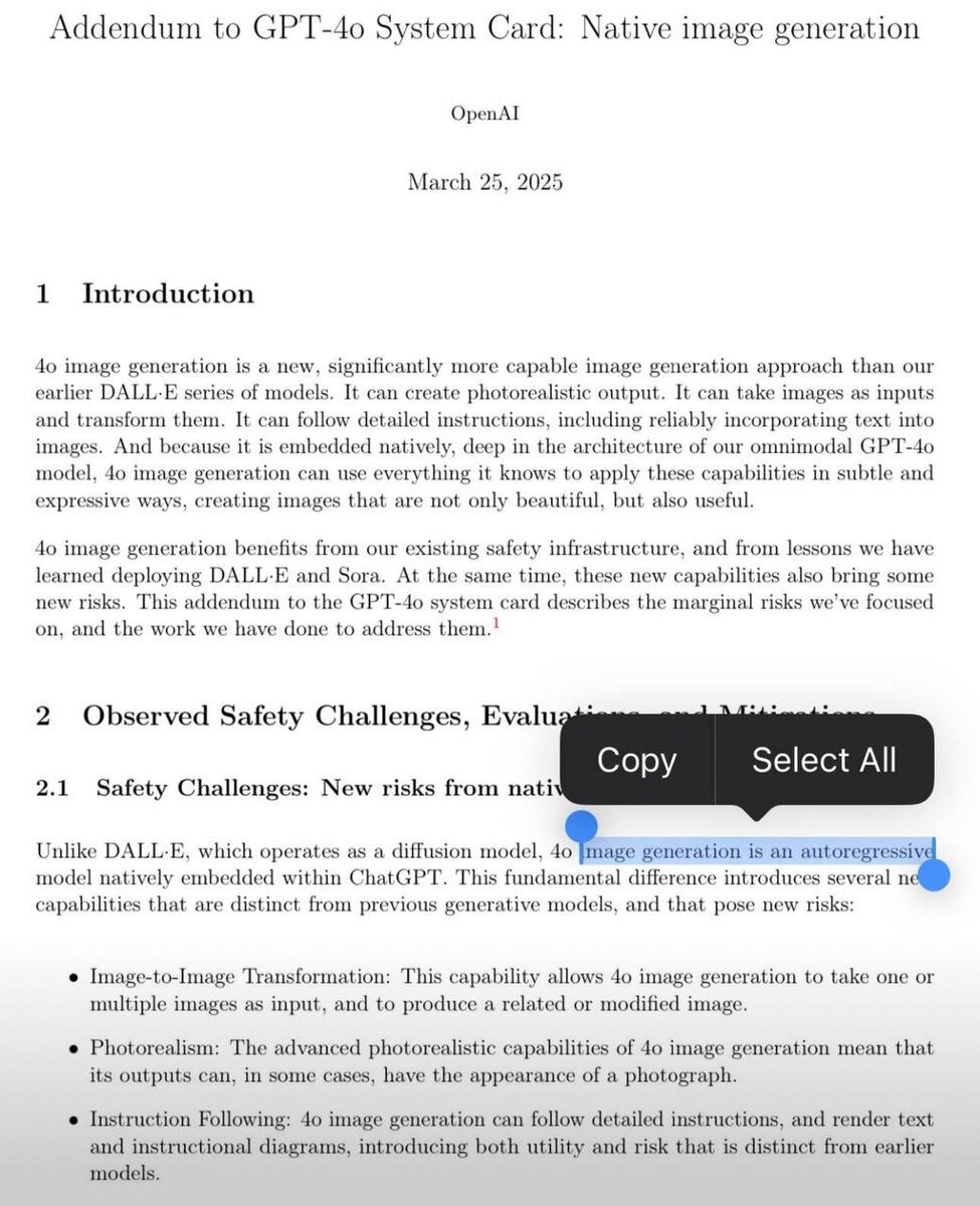 На изображении фрагмент документа от OpenAI под названием «Addendum to GPT-4o System Card: Native image generation» (25 марта 2025 года), где описывается новый подход к генерации изображений в GPT-4o. Ключевое отличие: Генерация изображений в GPT-4o основана не на диффузионной модели, как у DALL·E, а на авторегрессионной модели, встроенной нативно в архитектуру GPT-4o. Как это работает — простое объяснение 1. DALL·E (старый подход): • Использует диффузионную модель, которая «очищает» случайный шум, шаг за шагом приближаясь к финальному изображению. • Процесс итеративный и внешний по отношению к ChatGPT. 2. GPT-4o (новый подход): • Генерация изображений встроена внутрь GPT-4o, т.е. это часть общей модели, а не отдельный модуль. • Используется авторегрессия — тот же принцип, что и при генерации текста: • Модель создаёт изображение пиксель за пикселем (или патч за патчем), предсказывая следующий элемент на основе уже сгенерированных. • Всё это делается внутри единой модели, которая зн