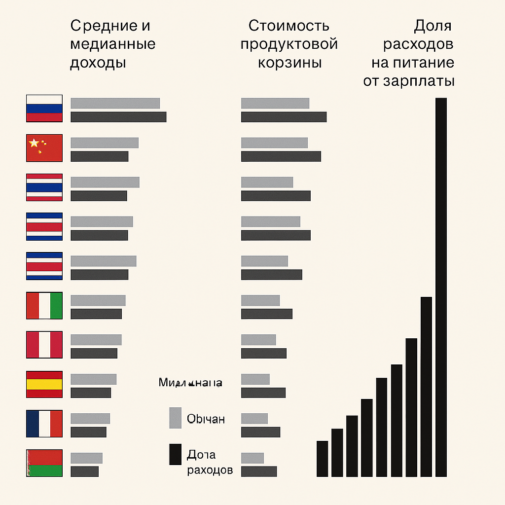 Примечание: Доля для семьи рассчитана исходя из суммарного дохода двух средних зарплат. В странах с низкой долей (США, Люксембург, Великобритания) расходы на продукты составляют около 8–12% бюджета. Большинство развитых стран Европы укладываются в 10–20%. Например, Германия ~12%, Италия ~20%. В развивающихся странах доля значительно выше: Таиланд порядка 35–37%, Вьетнам около половины дохода только на питание одного человека. Россия по средней зарплате находится ближе к середине списка – около 28–35% (для одного работника ~28%, для семьи с двумя заработками ~35%). Казахстан, Беларусь, Украина демонстрируют ещё более высокий процент (30–50%), несмотря на низкие цены, из-за невысоких доходов населения.