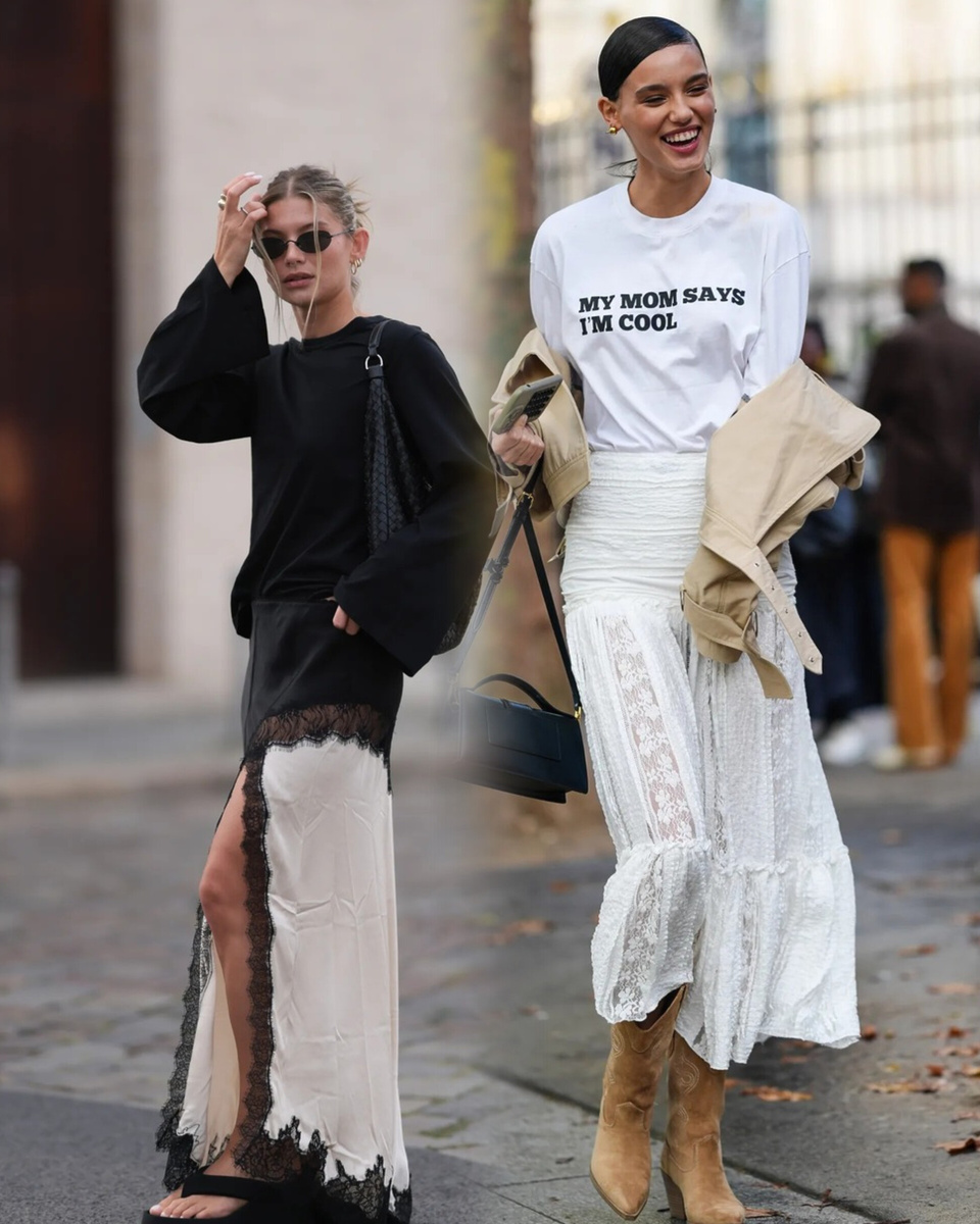 Весенний хит 2025: как сочетать длинную футболку и кружевную юбку