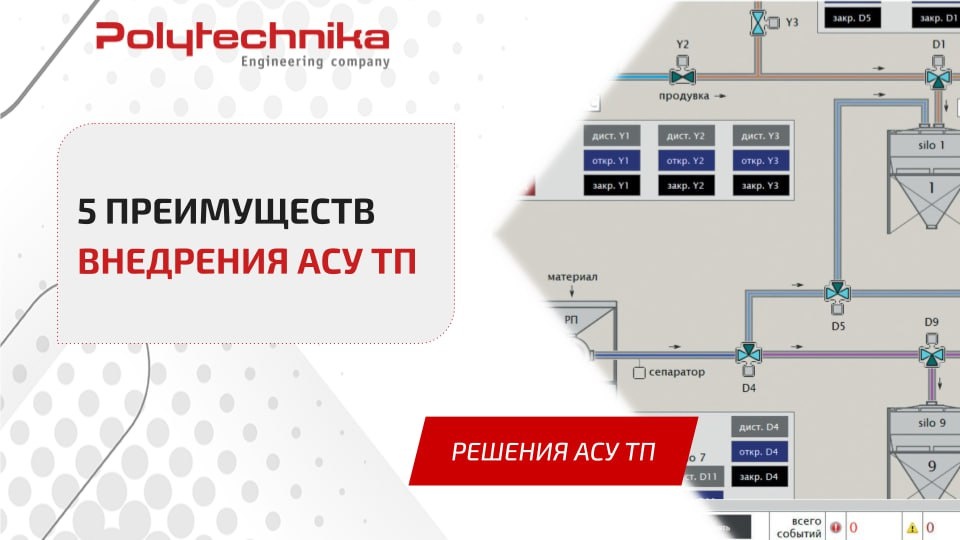 1️) Повышение эффективности труда. АСУ ТП автоматизирует контроль за всеми технологическими системами производства. Это значит, что персоналу необходимо выполнять значительно меньше рутинных операций. 2) Повышение качества продукта и сокращение брака. Система облегчает контроль качества на всех этапах производственного цикла. АСУ ТП отслеживает ключевые параметры работы оборудования, дозирование компонентов, загрузку и транспортировку сырья, и другие процессы. 3) Увеличение срока службы оборудования. АСУ ТП автоматически контролирует своевременность проведения сервисных работ на оборудовании, сокращая риск его поломки и вынужденных простоев. 4️) Защита сырья от хищения и ошибок при учете. Система способна вести полностью автоматизированный учет прихода, расхода и перемещения сырья, исключая человеческий фактор и связанные с ним издержки. 5️) Повышение качества анализа данных. АСУ ТП может быть интегрирована с верхним уровнем управления предприятия (такие системы как MES, ERP). Так