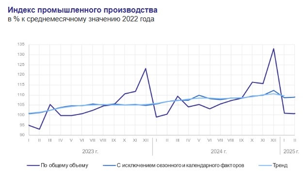 Росстат опубликовал свои данные по промышленному производству, из которых видно, что за первые 2 месяца 2025 года оно упало до минимальных за последний год значений, особо низкая динамика отмечена в феврале - рост всего на 0,2%. Общая динамика за январь-февраль 1,2%, в то время как все последние месяцы она была 3-4%, а в некоторых случаях и еще выше.