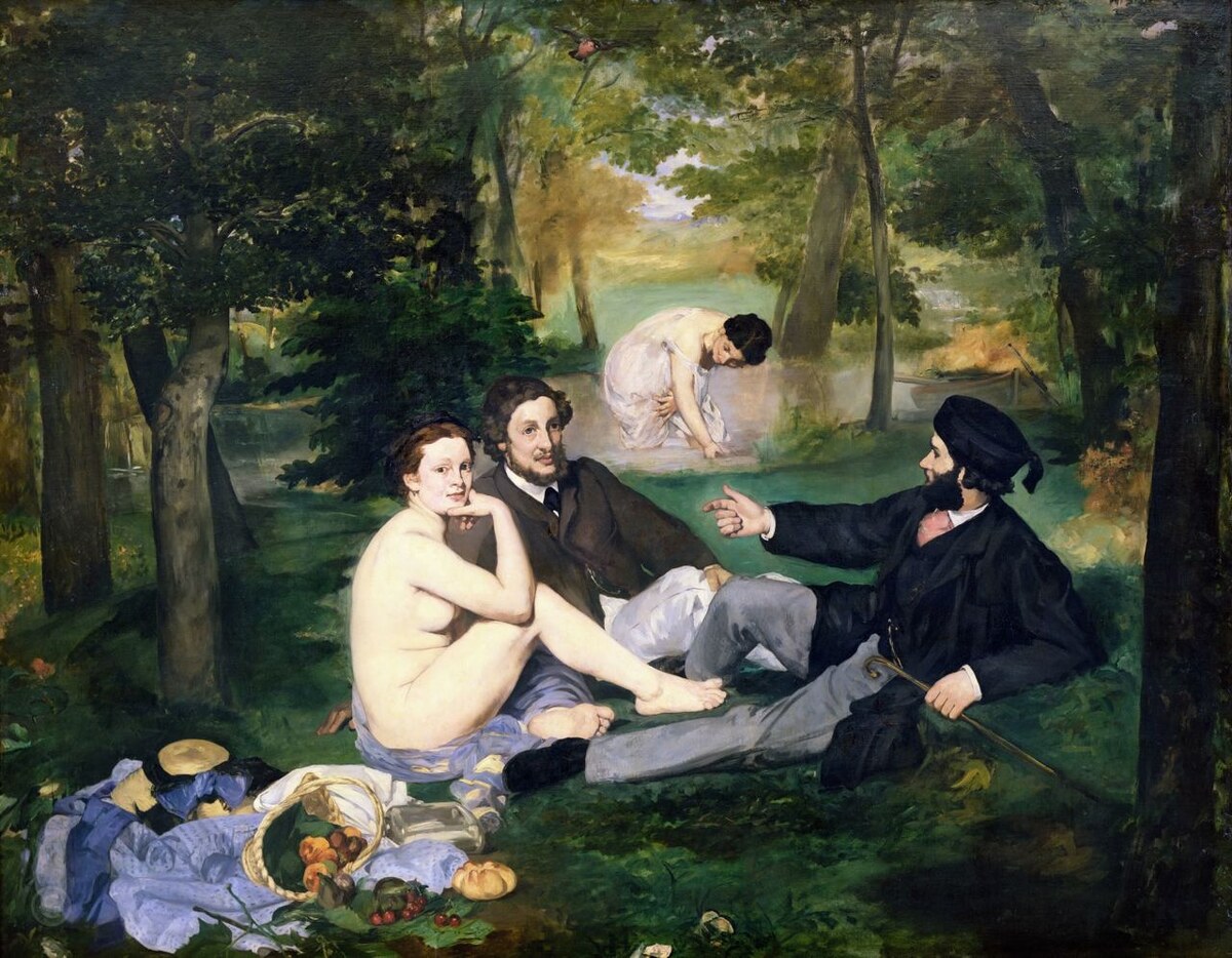 Почему три гения взяли один сюжет — и создали три разных мира? Где здесь революция, а где — пророчество? И как обнажённая женщина из XIX века изменила всё, что мы знаем о живописи? Читайте — и вы увидите знакомый мотив глазами бунтарей! Эдуард Мане, 1863 год. Парижский Салон отвергает его работу. Но именно «Завтрак на траве» (фр. Le Déjeuner sur l’herbe) взрывает искусство, как бомба. Почему? Перед нами пикник: двое одетых мужчин в чёрных костюмах и обнажённая женщина, бесстыдно смотрящая на зрителя. Рядом — корзина с фруктами, брошенное платье. Фон — не идеализированный пейзаж, а обычный лесок. Реальность, которая шокировала. — Размер: 208 × 264 см (огромное полотно для «неприличного» сюжета!).